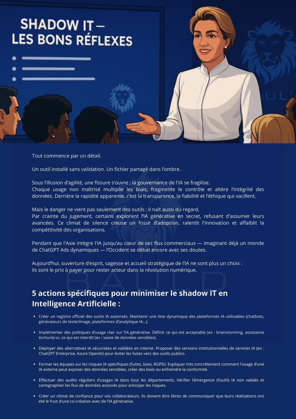 🧭 Sommaire de ce numéro exceptionnel Édito – Penser juste, à l’ère du rapide Une invitation à ralentir pour mieux comprendre. Mini essai — IA & Horizon – par Warda Baïliche Gouverner l’IA sans tuer l’inattendu. Expérience collaborateur & luxe – par Stéphane Aguilar L’alignement comme nouvelle excellence. TikTok / Douyin & Transparence algorithmique – par Stéphanie Zhou Lever le voile sur le pouvoir caché des algorithmes. Colloque Tunisie – IA, handicap & interculturalité Trois voix, trois réalités, une vision commune. BD — Opération BAULD : Shadow IT & IA non maîtrisée Un récit visuel fort, accompagné de 10 conseils stratégiques pour une gouvernance tech plus saine.